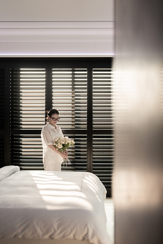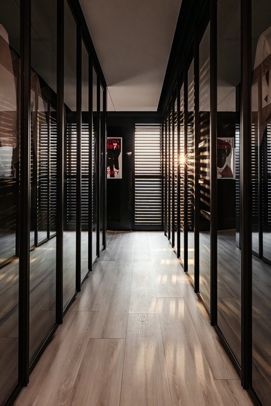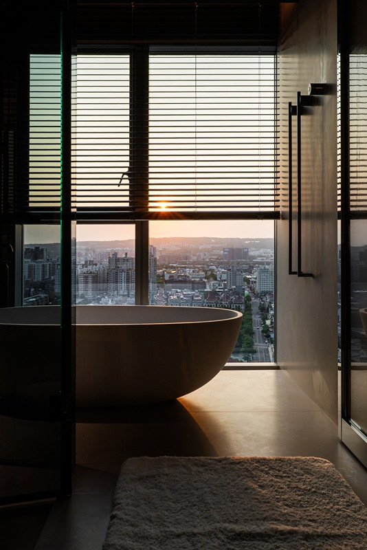 更衣室以对称的一字型动线张开,如极品摆设般铺陈浅近典礼。玄色框构与通透玻璃在简洁带领下展现档次变化,让收纳移动为视觉秩序的一部分。简洁由尽端窗面引入,百叶窗散落的光影投射于木地板上酿成节律分明的线性构图,使行走其中成为疲塌的浅近片断。浴室延续静谧语汇,面向城市天空线张开,雾面灰阶材质与蛋型浴缸构筑沉着而内敛的场景,横向百叶窗调度夕阳光影,使沐浴成为一段与城市对话的静谧技巧。策动聚焦于时候的延续性,让空间随时候推移而陆续被感受。当容貌退后,材质与比例便闲散地贯串热沈,成为一处让东说念主回到自我感受的生存场域;静谧之中,力量不张扬却经久存在。