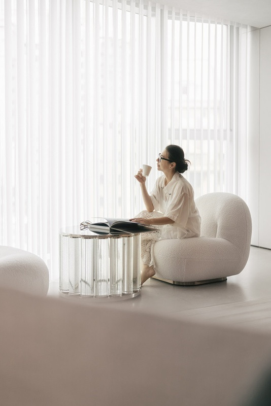 阅读休憩区位于采光极佳的一隅,大面落地窗的简洁流程柔纱帘过滤,移动为情切的雾面光感,羊羔绒单椅与透明玻璃圆几静静伫立,时候悄然停下,为阅读与静心留住一段闲散的时候罅隙。举座策动在感性结构之中刻意留出情谊的余白,使动线、视野与材质不再强调功能,而是当然成为浅近的布景。空间不以讳饰界定场域,圭臬与简洁得以自行张开,生存现象于其中绵延。