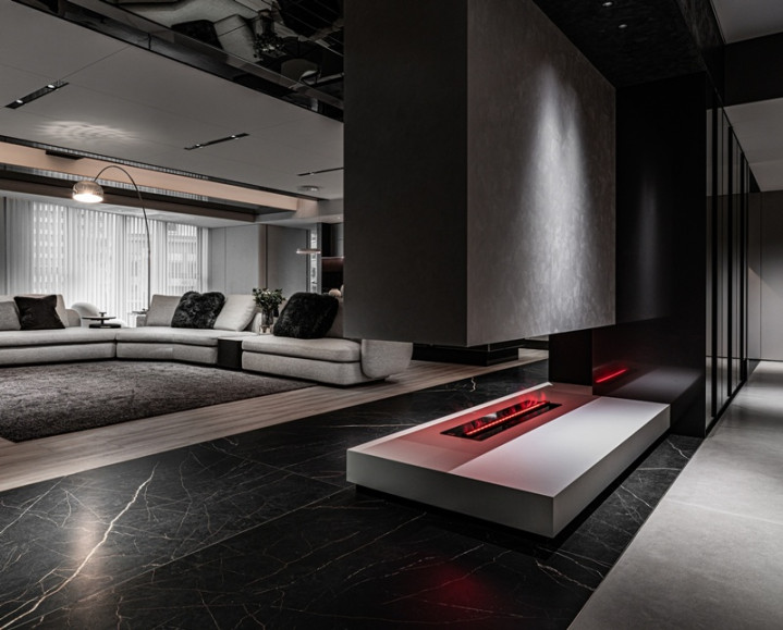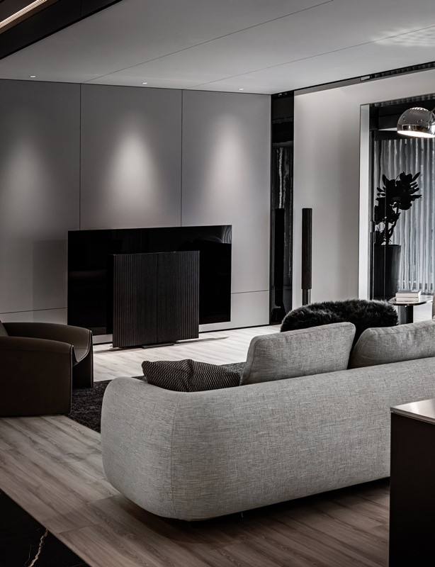 客厅算作全球中枢,以黑、灰、白为基调,呈现千里稳内敛的现代气质。玄色大理石纹地坪与温润木地板交错铺陈,开辟感性与温度并存的场域神采。素面灰色电视墙与局部镜面天花相互照耀,滚球(中国)app官网延展高度与空间深度。悬浮式壁炉则成为暖热的中介节点,在界定空间的同期,也保留视野的贯穿流动。弧形布质沙发搭配大面积地毯,以情切姿态围塑出包覆感。
